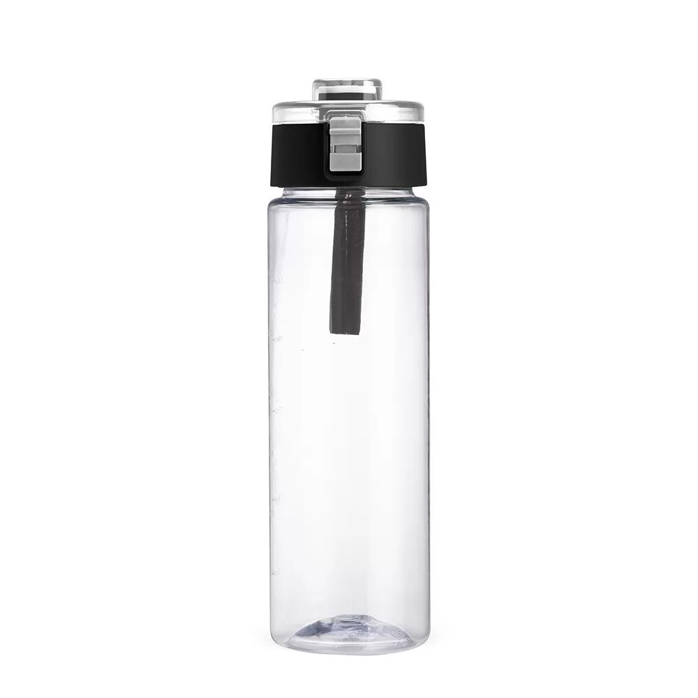 Garrafa feita em plástico livre de BPA com capacidade máxima de 750ml e marcação de volume impressa de até 700ml. Possui tampa rosqueável em polipropileno (PP) com protetor para o bocal, botão de acionamento e alça de mão em silicone.